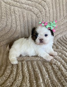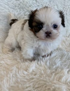 Annie Posted September 15, 2025 by shihtzusandy Availability: Available Sex: Female Parents: Ainsley & Dutton Birthdate: 9/8/25 Est. Weight: 5 lbs Price: $3500 Description: Beautiful gold and white baby