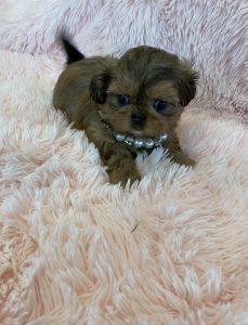 Ginger Posted October 27, 2025 by VDShihTzu_admin Availability: Available Sex: Female Parents: GG and Dutton Birthdate: 10/2/25 Est. Weight: 5 lbs Price: $3500 Description: Beautiful little gold/red girl